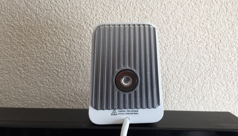 De achterkant is opvallend. Die is van metaal met een soort rooster, en een sterke magneet in het midden. Je kunt de Nubo dus heel makkelijk op een koelkast of een metalen strip ‘plakken’. De magneet is sterk genoeg om de camera op zijn plek te houden. Het geribbelde rooster wordt na verloop van tijd warm. Dat is ook precies de bedoeling ervan: warmte van de camera en de interne elektronica afvoeren. Het metalen raster maakt de camera nogal zwaar. Dat vinden we geen probleem; hij staat daarom vrij stevig. En aangezien hij geen standaard of sokkel heeft, is dat belangrijk.