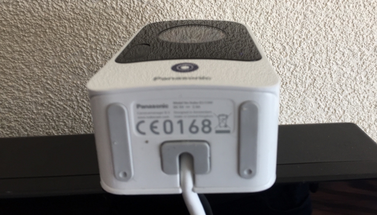 De onderkant van de camera is ook een vermelding waard. Die moet je namelijk zelf waterdicht maken. De usb-laadkabel gaat in een diepe sleuf, die je met een bijgeleverd stukje rubber zelf moet afdekken. Zo kan de Nubo Cam ook buiten worden opgehangen. Panasonic belooft dat hij stormen kan weerstaan, maar er wordt ook gewaarschuwd: de camera kan niet zwemmen. De Nubo Cam is voorzien van een IP64-certificatie.