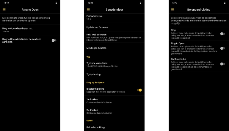 Verder zijn er nog opties met betrekking tot belonderdrukking. Vind je het geluid van je intercom vreselijk, dan kun je die uitschakelen op drie momenten: wanneer je Ring, Ring to Open of de Continuïteitsmodus activeert. Dat betekent dat je geen geluid hoort van je intercom en dat mensen dus zomaar ineens voor je deur kunnen staan — maar als je aan de straat woont en geen gezamenlijke voordeur hebt, dan is dat eigenlijk altijd het geval. Je kunt de Nuki Opener en zijn applicatie niet gebruiken voor tweewegcommunicatie, helaas.