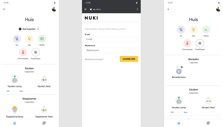 Het is mogelijk de Nuki Opener te koppelen met de Google Assistent. Als je de Google Home-app opent dan is de kans groot dat er bovenin een melding staat dat je Nuki kunt toevoegen. Als je dit doet, en de simpele stappen opvolgt, dan zou je de deur beneden ook moeten kunnen ontgrendelen met een simpel commando als “Hey Google, ontgrendel de benedendeur”. Je dient dat commando met een pincode te bevestigen, maar helaas werkt het invoeren daarvan niet goed in de Nederlandse versie van de Assistent. Het is nu dus onbruikbaar.