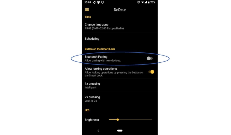 Bluetooth pairing via de knop op het slimme slot zou na installatie standaard uitgeschakeld moeten zijn. Nu blijft die functie standaard aan staan, en dat betekent dat andere smartphones met een druk op die knop gekoppeld kunnen worden. Niet erg veilig, dus uitschakelen.