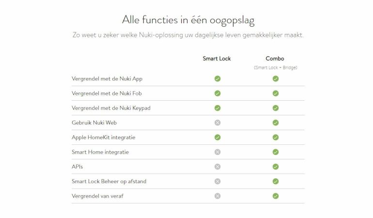 Een bridge is strikt genomen niet noodzakelijk, je bedient de Nuki dan uitsluitend via Bluetooth. Maar de bridge brengt wel heel wat handige functies met zich mee. Vooral de mogelijkheid om te openen of afstand is een echte meerwaarde. Bovendien kan je het slot ook beheren en de logs bekijken vanop afstand. Een volledige lijst vind je hieronder.