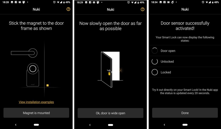 Een nieuwe toevoeging aan het Nuki slot is de deursensor. Het is een piepklein metalen plaatje, voorzien van kleefband, dat je mooi naast de Nuki Adapter dient te kleven op de deurstijl, niet op de deur zelf (uiteraard). Vervolgens doorloop je een korte kalibratieprocedure, en klaar. Je kunt er ook voor kiezen om de deursensor activiteit in de logs op te nemen.