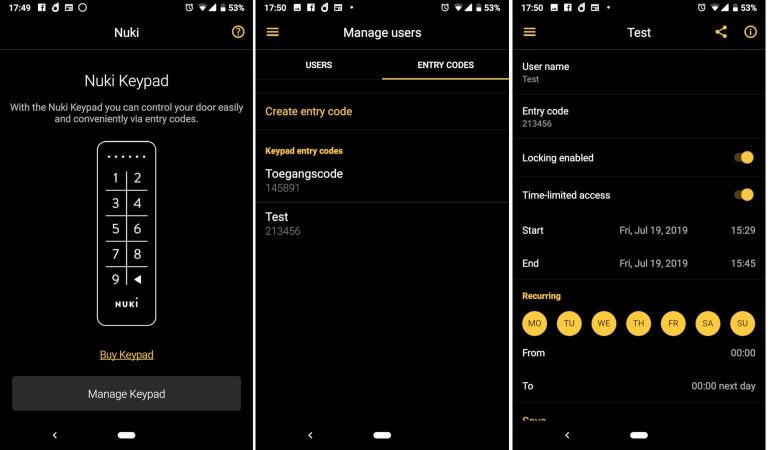 Via de Nuki app kan je nu zescijferige codes aanmaken. Je kunt ze ook een naam geven, zo zie je in de log perfect wie de deur geopend heeft. Je kunt ze ook in de tijd beperken. Let op, codes die beperkt zijn in de tijd verdwijnen niet na gebruik. Je kunt ze later aanpassen voor hergebruik op een ander tijdstip, maar omwille van veiligheidsredenen raden we aan ze te verwijderen.