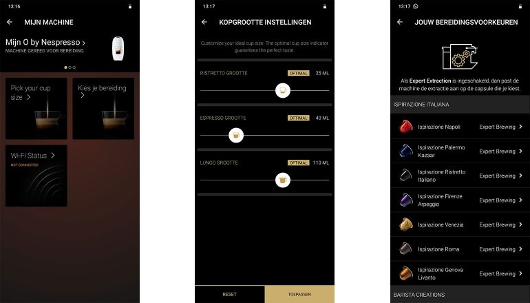 Wanneer je iets wil veranderen aan je koffie, dan dien je de app te openen. Je kunt hier bijvoorbeeld de hoeveelheid water per capsule instellen. Dat kan niet in één keer en moet je dus per capsule regelen. Drink je alleen dezelfde soort koffie, dan is dat geen probleem. Heb je – net als wij – een flinke verzameling varianten, dan is dat een hels karwei. Per capsule wisselt het ook het aantal opties. Naast Expert Brewing bestaat ook de mogelijkheid voor ristretto, espresso en lungo te kiezen; maar dat geldt dus niet voor alle koffies.
