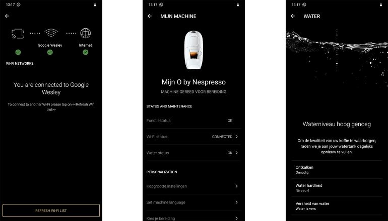 Dan hebben we de app nog. Na de fysieke installatie moet je het systeem koppelen aan je wifinetwerk. Om contact te kunnen maken met O by Nespresso moet je wifi, bluetooth en je locatie aanzetten, want anders ziet je smartphone hem niet. Dat lijkt ons een beetje overdreven wanneer je even snel de instellingen van je koffie wil inzien of aanpassen. Bovendien verliest de O constant de verbinding met het netwerk en moet je dus iedere keer – bij het opstarten van de app – wachten tot de verbinding met het netwerk gemaakt is.