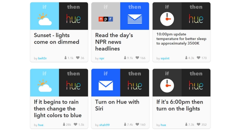Het was al een tijdje mogelijk om IFTTT te gebruiken wanneer je Hue wilt laten communiceren met andere diensten of apparaten en dit is en blijft nog steeds één van de meest gebruikte diensten om producten en diensten met elkaar te verbinden. Hoe IFTTT precies werkt hebben we al eens uitgebreid beschreven en voor nu kunnen we alleen toevoegen dat Hue hier perfect mee werkt. Maar, met de tweede generatie Hue-app maakt Philips een aantal van de dingen die met IFTTT mogelijk waren ook zelf mogelijk. De routines zijn hiervan het beste voorbeeld. Je kunt bijvoorbeeld de zonsopgang simuleren op een specifiek tijdstip zodat je heerlijk rustig wakker wordt. Ook kun je de lichten laten dimmen of een andere kleur geven op een specifiek moment van de dag. Is het bijvoorbeeld half 6 en betekent dat het einde van de werkdag, laat dan de lichten automatisch op dat tijdstip dimmen zodat je rustig de avond ingaat. En zoals hierboven omschreven is het dus mogelijk om de lichten automatisch te activeren of deactiveren wanneer je thuiskomt of weggaat.