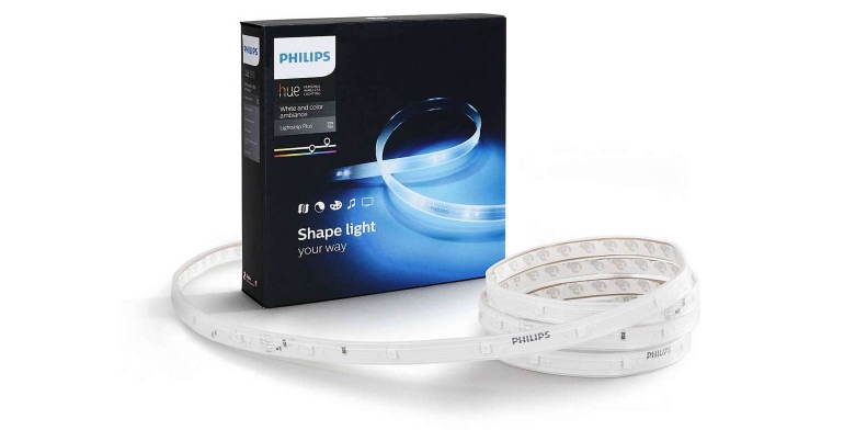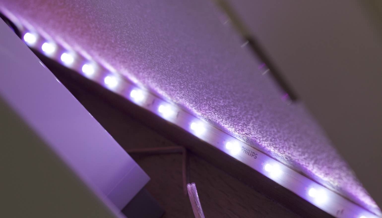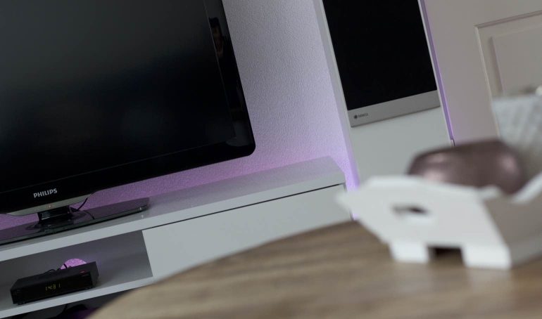 Om de woonkamer bij het tv-gedeelte te voorzien van wat sfeerverlichting hebben we gekozen voor de Hue Lightstrip Plus. Deze nieuwe versie van de led-strip heeft een hogere lichtopbrengst dan zijn voorganger en kan voor 75 euro (2 meter basis) gekocht worden. Je kunt de strip zelf op maat afknippen of met stukken van 1 meter verlengen tot maximaal 10 meter (25 euro per meter). Ook de Lightstrip Plus kan 16 miljoen kleuren weergeven maar is dus een stuk flexibeler en vooral bedoeld als sfeerverlichting. Je kunt de strip buigen in elke gewenste vorm en vervolgens middels de meegeleverde 3M-tape bevestigen aan nagenoeg elk oppervlak. Wij hebben gekozen voor een plaatsing bovenop de plint achter de tv-kast. Je kunt de strips bijvoorbeeld ook gebruiken voor onder of achter de bank, voor in een kast of zelfs voor verlichting in de keuken.