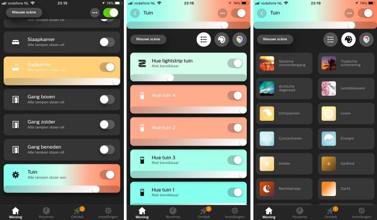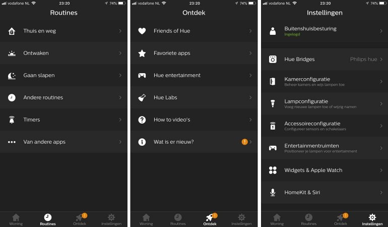 De Tab routines geeft je de mogelijkheid om te automatiseren. Bijvoorbeeld het uitschakelen van alle lampen als je weggaat of het langzaam aanzetten van de lampen in de slaapkamer zodra de zon opkomt. Ook kun je timers instellen en zelf routines aanmaken. De tab Ontdek biedt je extra opties, waaronder formules (experimenten), wat eigen betekent dat het betafuncties zijn die nog niet in de app zelf zitten. Ook kun je Hue koppelen aan andere smarthome-producten (Friends of Hue) en Hue-apps van derden downloaden. Tot slot is er de tab Instellingen. Hier kun je de lampen en kamers configureren, accessoires toevoegen, HomeKit (Siri) instellen, de software updaten en widgets aanmaken.