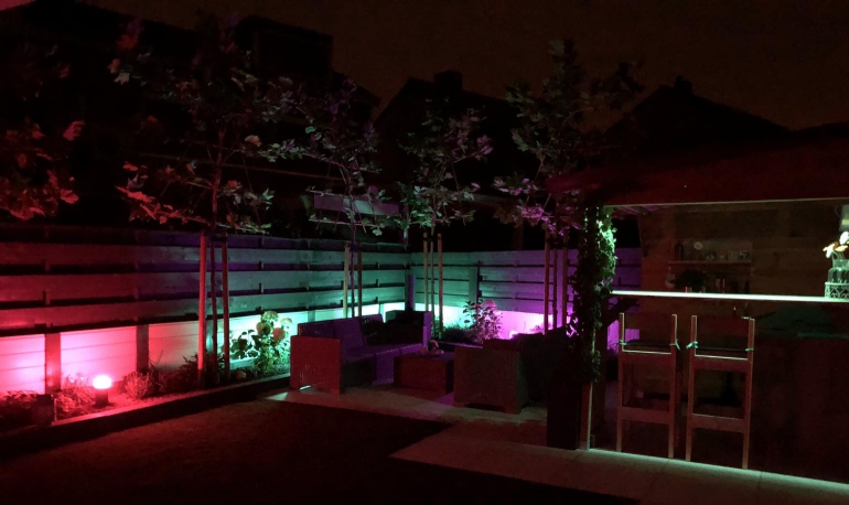 Met de dimmer switch kun je ook de helderheid van de lampen aanpassen of simpelweg de lampen aan- of uitzetten. Ook kun je de Hue motionsensor gebruiken, zodat de lampen aanspringen als iemand de tuin inloopt, al is dit in een tuin met bewegende takken en vliegende vogels wellicht niet de beste oplossing.