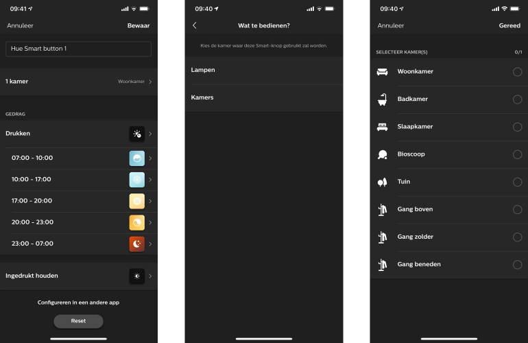 De Smart knop (Button) biedt wat meer mogelijkheden. Als je de in de instellingen van de knop duikt heb je allereerst de mogelijkheid om één specifieke ruimte aan de knop te hangen of je kunt ervoor kiezen specifieke lampen te selecteren. De gekoppelde ruimtes zijn beperkt tot één, terwijl je een onbeperkt aantal lampen kunt koppelen.