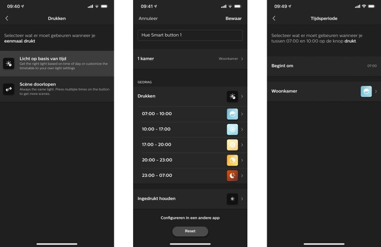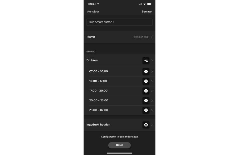 Vervolgens heb je de mogelijkheid gedragingen in te stellen voor eenmaal drukken én voor ingedrukt houden. Bij drukken kun je kiezen uit licht op basis van tijd en het doorlopen van scenes. Wanneer je kiest voor op basis van tijd dan kun je vijf tijdsvakken aanmaken met hun eigen scenes. Wanneer je dus tussen 07.00 en 10.00 op de knop drukt zal de scene die je aan dat tijdsvak gekoppeld hebt gestart worden.