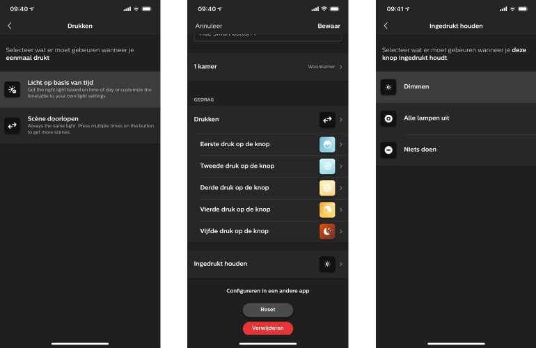 Kies je voor het doorlopen van scenes dan kun je vijf verschillende scenes van de gekoppelde ruimte selecteren. Met 1 tot 5 drukken op de knop doorloop je deze scenes en kun je dus zelf bepalen welke scene op dat moment gebruikt wordt. Tot slot kun je bij de optie ‘ingedrukt houden’ kiezen uit drie mogelijkheden: het dimmen van de lampen door de knop ingedrukt te houden, het uitschakelen van de lampen door de knop ingedrukt te houden of helemaal niets doen. Het is dus alles bij elkaar een simpele knop die toch veelzijdig is en op verschillende handige manieren ingezet kan worden.