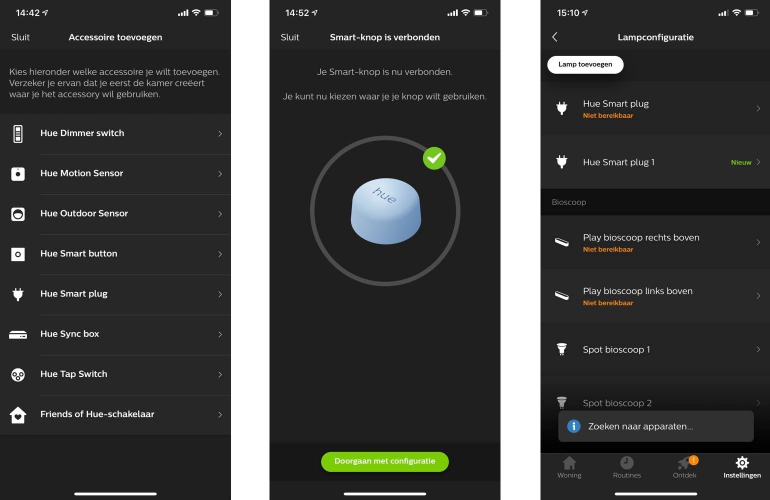 De installatie van deze twee Hue-producten is een fluitje van een cent, zeker als je al meerdere Hue-producten in huis hebt. Het is een kwestie van de Hue-app openen en bij ‘instellingen’ en ‘accessoireconfiguratie’ een nieuw product zoeken. Natuurlijk moet het product even met een druk op de knop geactiveerd worden, maar niet veel later zie je de slimme stekker en slimme knop in de app verschijnen.