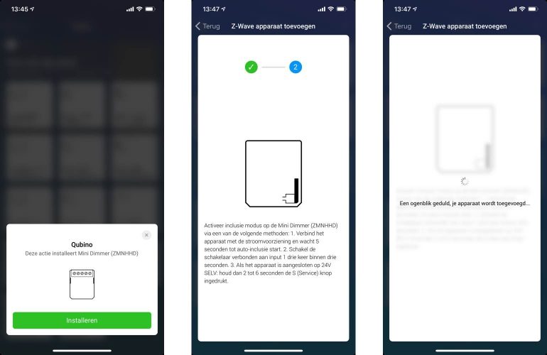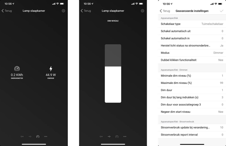 Voordat je alles terugplaatst en vastschroeft is het verstandig de lamp aan te zetten en de module toe te voegen aan je hub. De module schakelt automatisch aan staat ook direct in de ‘inclusionmodus’ waardoor de dimmer vrijwel direct gevonden wordt en met een paar simpele drukken op de knop en in de app toegevoegd is. Een simpele test in de app (aan, uit en dimmen) bevestigt dat de dimmer werkt en nu kan de schakelaar weer op de muur gemonteerd worden.