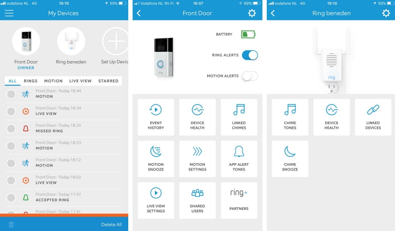 Als we naar het gebruik kijken dan kijken we eerst naar de Ring-app, een gratis applicatie voor Android en iOS. Eenmaal gedownload en een account aangemaakt is het toevoegen van een product eenvoudig. Volg de stappen en binnen enkele minuten heb je het complete systeem werkend. De app zelf is strak vormgegeven en heeft een duidelijke lay-out meegekregen. Alles is op een logische plek geplaatst, zoals de instellingen per product, en met grote iconen kun je toegang krijgen tot belangrijke functies.