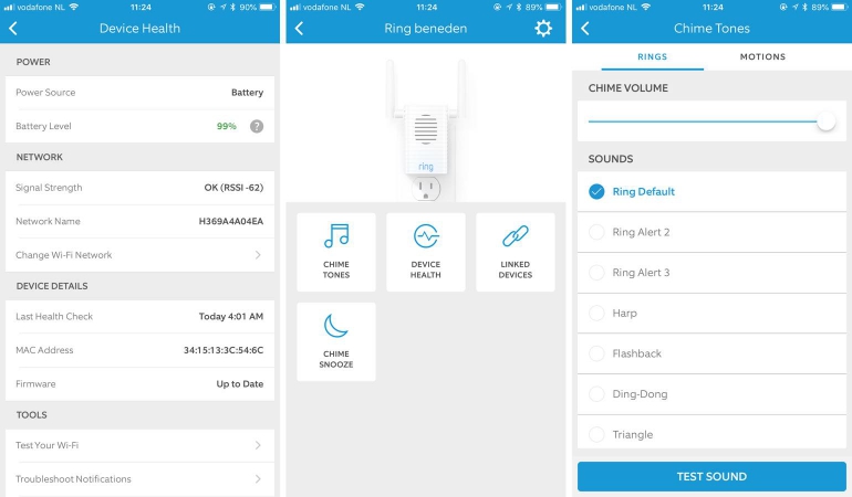 De Chime Pro heeft wat minder instellingsmogelijkheden. Bij dit apparaat kun je echter wel uit tal van (aan)beltonen kiezen en het volume bepalen. Wij hebben de Chime Pro in de gangkast hangen zodat de beltoon zowel boven als beneden te horen is. Niet alle beltonen zijn even luid en duidelijk dus test er een paar zodat je de luidste kunt gebruiken. Ook bij de Chime Pro kun je de gezondheid inzien, en daar is met name de WiFi-verbinding interessant. Je kunt de Chime Pro ook snoozen voor 1 tot 12 uur.
