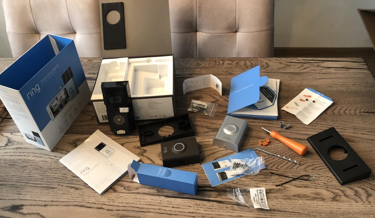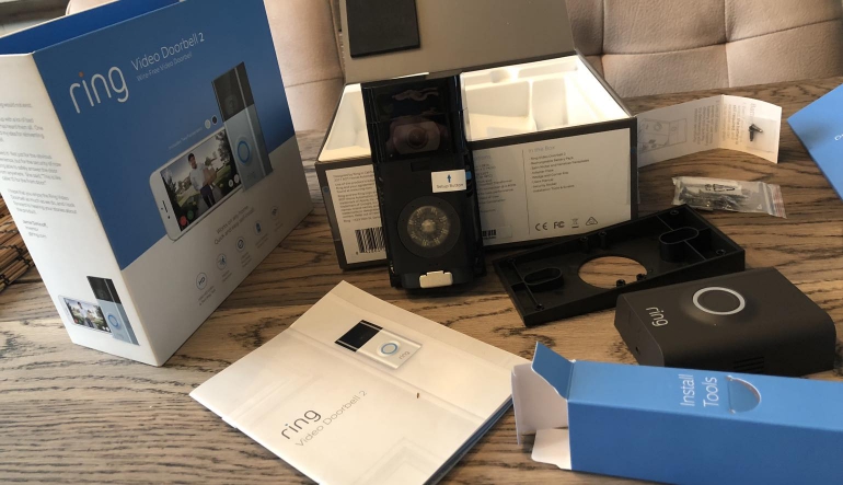 Als we de doos van de Ring Video Doorbell 2 openmaken dan schrikken we even van de grote hoeveelheid accessoires, schroefjes, hulpstukken en documenten. Maar, eenmaal geordend blijkt dat het bedrijf erg goed nagedacht heeft over de installatie en dat het de consument zo eenvoudig mogelijk gemaakt wordt. Alles wordt duidelijk uitgelegd en er zijn video’s beschikbaar voor alle onderdelen van de installatie. Ook wordt daadwerkelijk alles meegeleverd, zelfs de schroevendraaier, de boor en de waterpas. Nee, de boormachine zul je toch wel echt zelf moeten regelen. Je hoeft overigens niet alles te gebruiken dat meegeleverd wordt. Afhankelijk van hoe en waar je de deurbel monteert en hoe je deze aansluit zijn er verschillende accessoires.