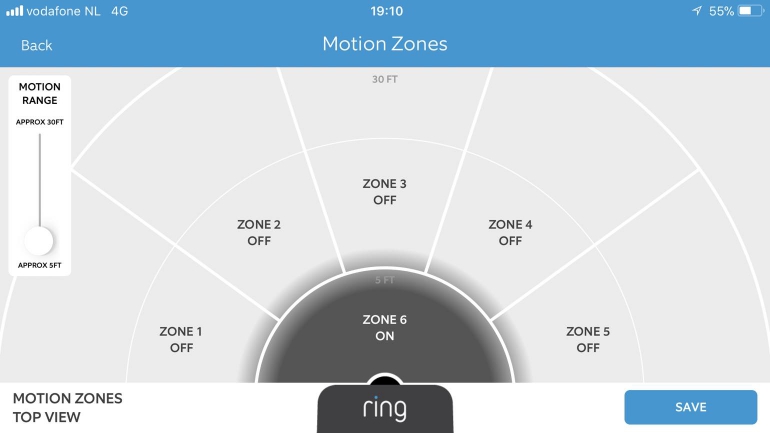Naast het feit dat de deurbel een notificatie stuurt en de Chime Pro laat rinkelen zodra er iemand aan de deur staat is er dus ook een bewegingssensor die notificaties kan sturen en video’s kan maken zodra er een beweging waargenomen wordt. In de instellingen van ‘Motion’ kun je hiervoor zones aanmaken. Je kunt exact bepalen wat de maximale afstand vanaf de deurbel is waarbinnen een beweging waargenomen mag worden, en zelfs de hoek kun je vrij nauwkeurig bepalen. Ook is het mogelijk bepaalde hoeken uit te sluiten. Dit werkt zeer nauwkeurig, zo blijkt uit onze test. We wonen nagenoeg direct aan een straat waar veel auto’s voorbij rijden en dus wilden we alleen bewegingen detecteren die zich op de stoep, direct voor de deur, bevinden. We stellen de bewegingszones in op 1,5 meter en vervolgens worden voorbij rijdende auto’s genegeerd maar iemand die voor de deur langsloopt wordt wel geregistreerd.
