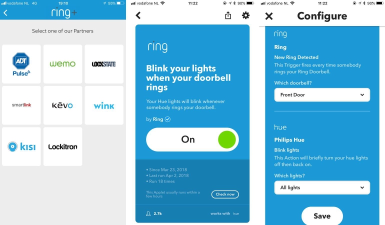 Echter, er is ook ondersteuning voor IFTTT. Dit betekent dat je de deurbel middels een IFTTT recept kunt koppelen aan andere producten die IFTTT ondersteunen. Zo hebben wij de deurbel middels een IFTTT recept gekoppeld aan de Philips Hue-verlichting. Zodra de bel gaat beginnen de lichten te knipperen. Althans, dat zou de bedoeling moeten zijn. Helaas is de integratie van IFTTT matig en voor zover wij kunnen zien ligt het probleem aan de kant van Ring. Zodra de deurbel gaat gebeurt er namelijk niets. Maar, 10 tot soms 30 minuten later beginnen de lampen te knipperen. Een dergelijke vertraging mag natuurlijk niet. We hebben van meerdere gebruikers gehoord die dit probleem ervaren hebben, in meer of mindere mate. En de Philips Hue-verlichting werkt perfect met andere apparatuur. In onze optiek is hier dus nog werk aan de winkel voor Ring.