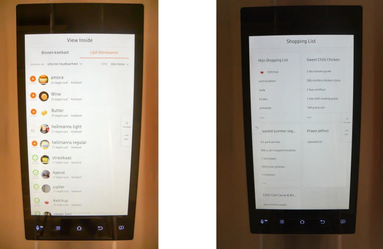 Gelukkig is het ook mogelijk om details over de houdbaarheid van een specifiek product in te voeren zonder de labels te gebruiken. Je maakt dan een lijst met alle aanwezige etenswaren, die je kunt (aan)vullen via het scherm van de koelkast. Wanneer je een nieuw product opbergt voeg je het toe aan deze lijst. Je kunt hier dus ook aangeven wat de houdbaarheidsdatum is, zodat je erop attent wordt gemaakt wanneer de houdbaarheid van een product dreigt te verlopen. Daarbij kun je niet alleen onderscheid maken tussen het koel- en vriesgedeelte; ook producten uit je voorraadkast kunnen apart worden bijgehouden. In de praktijk vereist het de nodige discipline en tijd om elk product in te voeren op de koelkast. Niet een klus waar we op zaten te wachten toen de weekendboodschappen uitgestald stonden op het aanrecht. Ook moet je regelmatig inventariseren wat er niet meer aanwezig is. Het apparaat is niet dermate slim dat het zelfstandig “ziet” dat een (ooit) ingevoerd product niet meer aanwezig is. Je zult dus altijd zelf handmatig de lijst moeten blijven bijhouden. In ons gezin vonden we het van pas komen voor producten met een wat langere houdbaarheid en die je slechts af en toe gebruikt. Denk aan sauzen uit een flesje. Die werden nog wel eens vergeten en kwamen meestal weer naar boven bij een schoonmaakbeurt, om vervolgens te worden weggegooid. Dit kun je nu voorkomen, aangezien je tijdig een waarschuwing kunt krijgen dat het product aan het einde van zijn houdbaarheid zit. Wij vonden het ook goed werken bij (zeer) kort houdbare producten zoals vlees(waren) en zuivel. Je bent je er veel bewuster van wat er eerst opgemaakt moet worden. Daardoor kun je betere keuzes maken wanneer je voedselverspilling tot een minimum wilt beperken. Het nut van het invoeren van producten met een houdbaarheid van enkele weken vonden we van minder belang. Deze worden bij ons in de regel ruim voor het verstrijken van de uiterste gebruiksdatum gebruikt. Wel kan het nuttiger worden al deze producten wèl in te voeren indien je suggesties wilt krijgen voor maaltijden aan de hand van de producten die je in huis hebt. Hierover later meer. In feite kan iedereen ervoor kiezen tot op welk niveau je dit wilt doorvoeren in je huishouden. Het vereist namelijk de nodige discipline en je moet toch regelmatig de lijst ingevoerde producten handmatig nalopen om je voorraad levensmiddelen te actualiseren. Idealiter bezit ieder product een chip die door de koelkast kan worden uitgelezen, waardoor het handmatig invoeren en onderhouden niet meer nodig is. Maar dat is op dit moment nog toekomstmuziek.