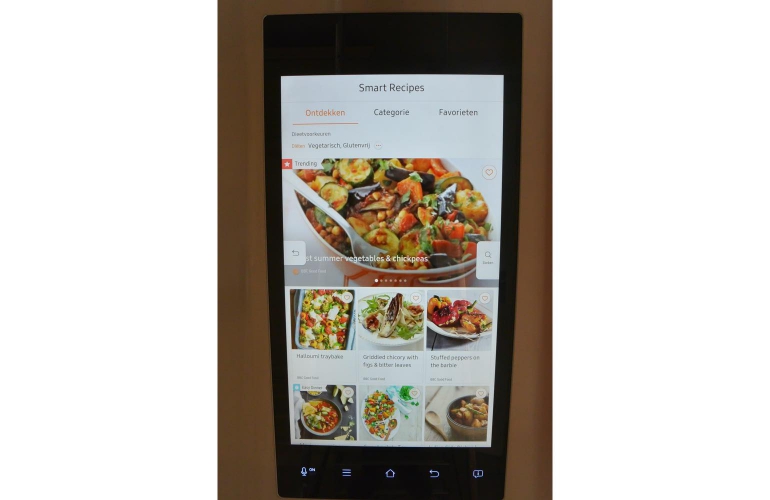 Wat gaan we vandaag eten? Een veelgestelde vraag in menig gezin. Samsung claimt die zorg uit handen te kunnen nemen met haar slimme koelkast. De Family Hub kan suggesties doen voor recepten op basis van de aanwezige levensmiddelen (mits ingevoerd uiteraard!). Helaas werkt dit nog niet (goed) in het Nederlandse taalgebied. De database met recepten van verschillende bronnen is in het Engels en de ingrediënten dus ook. Het gevolg is dat er geen voorstellen kunnen worden gedaan, aangezien de aanwezige levensmiddelen door ons in het Nederlands zijn ingevoerd. Het huidige concept van suggesties doen voor recepten op basis van de aanwezige producten komt bij ons dus (nog?) niet uit de verf. Daarom kiezen we ervoor om te gaan grasduinen in de beschikbare recepten via de Smart Recipes-app. De applicatie zelf is in het Nederlands, de recepten zijn in het Engels. Het is mogelijk om diverse dieetvoorkeuren aan te geven. Aangezien een van de gezinsleden glutenvrij eet was dit interessant. Ook het vermelden waard: het is mogelijk om specifieke ingrediënten op te geven die je niet wilt gebruiken. Hierna kun je nog kiezen uit het soort gerecht. In totaal achttien categorieën waaronder soep, salade, lunch en diner. De lijst met recepten die vervolgens wordt getoond is omvangrijk en aantrekkelijk gepresenteerd inclusief een foto. Wanneer je een specifiek recept kiest, dan krijg je een lijst met benodigdheden (op het moment van schrijven in het Engels) die je individueel kunt selecteren en versturen naar je boodschappenlijst. Heb je alle spullen in huis en wil je het gerecht gaan klaarmaken? Dan kun je schakelen naar de kookmodus. Daarin wordt in het Engels de bereiding zelf uitgelegd. Dit is vrij basic en niet meer dan een uitgeschreven tekst die eventueel kan worden voorgelezen. Grappig om de koelkast te horen kletsen in het Engels, maar niet echt bruikbaar in de praktijk.
