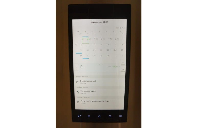 Op het scherm lees je standaard het weer af in je woonplaats plus de datum en tijd. Dit is te zien als het scherm van de koelkast niet wordt gebruikt en er een screensaver wordt geactiveerd. Een mooi detail is dat dit scherm automatisch oplicht wanneer je dicht in de buurt bent. Na een vooraf ingestelde tijdsduur zonder activiteit in de buurt gaat het scherm namelijk volledig op zwart. Wanneer je het touchscreen activeert kom je op het startscherm dat naar wens is aan te passen. Je kunt digitale agenda’s van alle gezinsleden integreren, zodat deze snel te raadplegen zijn op het scherm. Dit werkt goed: de agenda’s van meerdere profielen worden gecombineerd, zodat je in een oogopslag een overzicht hebt op de activiteiten van iedereen. Foto’s uploaden van je telefoon naar de koelkast is ook mogelijk via de Family Hub-app. Leuk om het scherm van de koelkast een persoonlijk tintje te geven. Een “briefje” achterlaten op de koelkast? Dat doe je met de memofunctie. Daar werd bij ons gretig gebruik van gemaakt.Dit kan toch ook gewoon op een stukje papier? Ja natuurlijk, maar dit had een hoger fungehalte! Het digitale whiteboard werd ook veel gebruikt. Hier kun je handgeschreven boodschappen en tekeningen mee maken. Die zijn ook te versturen naar de telefoons van de gezinsleden binnen de Family Hub-app.