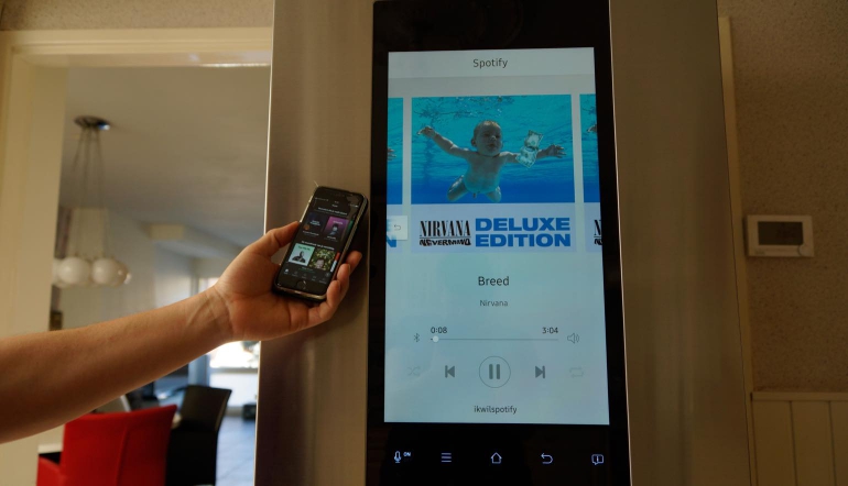 Het is mogelijk muziek af te spelen via de Family Hub. Bovenop de koelkast is een speaker van 5 Watt aanwezig. Een van de manieren om muziek af te spelen is via Spotify Connect. Een kwestie van de app openen op je smartphone en de koelkast als afspeelapparaat gebruiken. Je kunt via de koelkast het geluidsniveau regelen of door een album of afspeellijst navigeren. Uitgebreid bladeren blijf je op je smartphone of tablet doen. Luister je liever naar de radio? Dan kun je de app van TuneIn gebruiken. Ook aan ondersteuning voor Bluetooth is gedacht: de speaker van de koelkast is dus ook geschikt om als externe speaker te gebruiken. We hebben veel plezier gehad van de mogelijkheden van de Family Hub als muziekspeler in onze keuken. Maar er zat gewoon weinig body in het geluid zelf. Daarbij wil ik wel opmerken dat we verwend zijn op dit gebied. Normaal wordt een kwalitatief goede tafelradio ingezet als muzikaal gezelschap in de keuken.