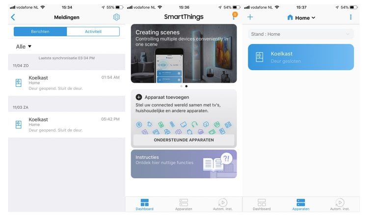 Wanneer je specifieke instellingen wilt inzien of wijzigen zonder gebruik te maken van het koelkastscherm, maak je gebruik van een tweede app: SmartThings. Dit lijkt niet direct logisch, maar het past in de filosofie van Samsung, waarin je meerdere “connected devices” controleert vanuit de SmartThings-omgeving. Ook kun je hiermee voorkomen dat de kinderen gaan zitten rommelen in de instellingen en bijvoorbeeld de ingestelde temperatuur van het koel- of vriesgedeelte van de Family Hub wijzigen. Zij hebben in principe voldoende aan de Family Hub-app. Deze slimme koelkast kan dus ook deel uitmaken van het SmartThings-platform. Dit is het ecosysteem van Samsung waar je ondermeer lichtschakelaars, thermostaten en slimme sensoren van Samsung op kunt aansluiten en processen in je huis mee kunt automatiseren en monitoren. Deze producten zijn echter (nog) niet in de Benelux te koop.Wel ondersteunt SmartThings Z-Wave, Zigbee en IFTTT waardoor de echte enthousiasteling een keuze heeft uit een groot aantal componenten om het huis mee te automatiseren. Er zijn daarnaast in toenemende mate huishoudelijke apparaten verkrijgbaar van Samsung die kunnen worden verbonden met SmartThings, waaronder wasmachines, robotstofzuigers en airconditioners. Indien je meerdere geschikte apparaten in huis hebt, kun je dus vanaf je telefoon of tablet kijken hoe lang het nog duurt voordat de was klaar is, of de robotstofzuiger zijn werk naar behoren doet en tegelijkertijd de koelkasttemperatuur wijzigen èn de airconditioning aanzetten.