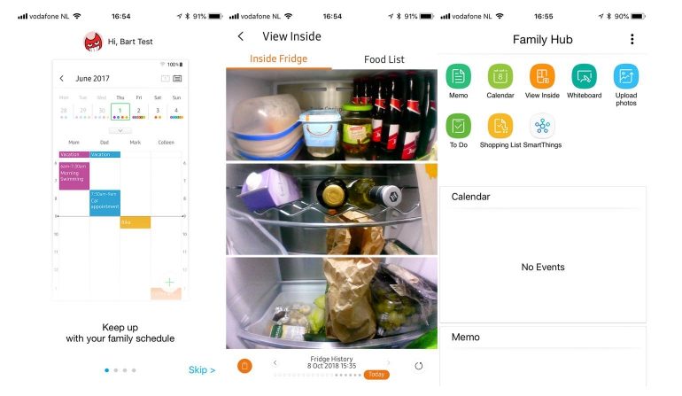 Een slimme koelkast kan natuurlijk niet zonder bijbehorende app. Voor deze review heb ik de iOS-versie van de Samsung Family Hub-app geïnstalleerd. Het koppelen van de koelkast met je smartphone gebeurt door het invoeren van de gegevens van je Samsung Account (aangemaakt tijdens de installatie van de koelkast) op je telefoon. Dit installeren en koppelen verliep zonder problemen.Via de telefoon heb je nu toegang tot de gekoppelde agenda’s en kun je dus de activiteiten van ieder gezinslid bekijken. Ook kun je via de whiteboard-functie briefjes en tekeningen sturen naar de koelkast. Verder is het mogelijk om in de koelkast te kijken en foto’s te uploaden naar de Family Hub voor een persoonlijk tintje op het koelkastscherm. Ook is er een snelkoppeling naar het SmartThings-platform van Samsung, waar diverse smarthome-functies zijn ondergebracht.