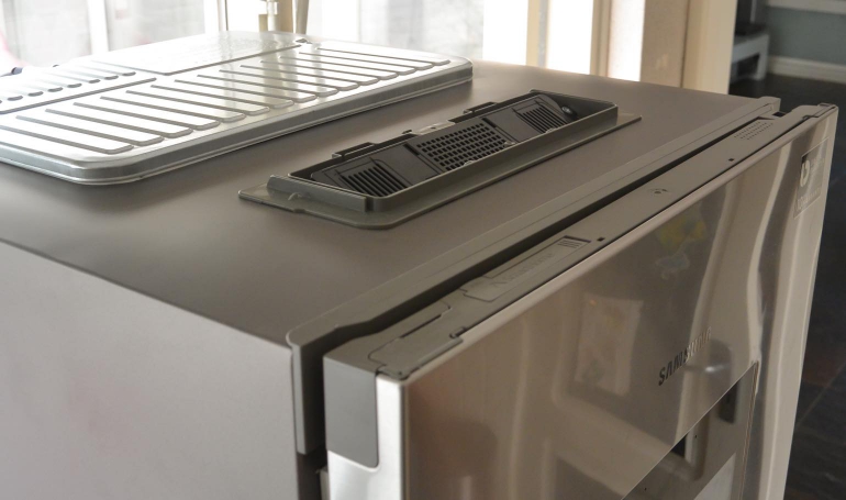 Het reviewmodel is ruim 1,92 cm hoog, 59.5 cm breed en 65 cm diep en weegt maar liefst 93 kilo. Het is niet een witgoedartikel dat je makkelijk even verplaatst. Vraag zeker even hulp wanneer de koelkast naar een andere plek moet. Het is een upside-down model; dit houdt in dat de koeling zich boven het apart te openen vriesgedeelte bevindt. Handig: je opent in de regel natuurlijk veel vaker de koelkast dan de vriezer. De twee deuren zijn uitgevoerd in glimmend rvs. De zijkanten in antraciet en dus afwijkend van kleur. Iets om in het achterhoofd te houden als je de koelkast in de keuken wilt integreren als onderdeel van je huisstijl. Het is een imposante verschijning met een luxe uitstraling, die de “wow-factor” van je keuken flink kan verhogen.
