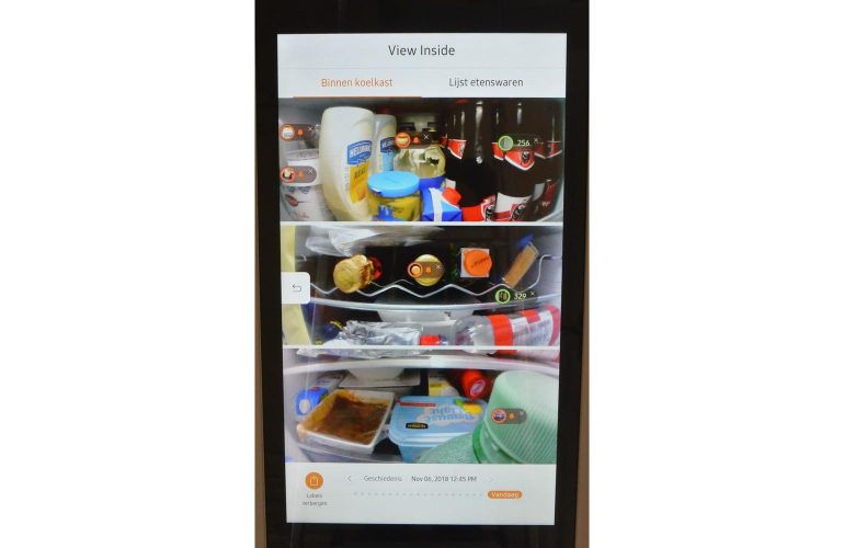 Een van de slimme mogelijkheden is food management. Dit geeft je een overzicht van je voorraad levensmiddelen. Hulpmiddel hiervoor zijn de drie ingebouwde camera’s in de deur. Er wordt iedere keer een foto gemaakt als de deur wordt gesloten. Zo heb je zicht op de inhoud van de koelkast via het koelkastscherm, of de Family Hub-app op je telefoon. Via de laatstgenoemde manier is het ook mogelijk om dit te doen als je in de supermarkt bent. Dit werkt in de praktijk prima. Zolang je beschikt over een redelijke verbinding via wifi of 4G uiteraard. Er is wel een beperking: het zicht beperkt zich voornamelijk tot de glazen plateaus en het wijnrek. De inhoud van de twee lades is nauwelijks zichtbaar en van de deur helemaal niet. Logisch aangezien de drie camera’s in de deur zelf zitten en een beperkte kijkhoek hebben. Ook heb je minder overzicht als je dingen achter elkaar hebt opgeborgen op een plateau. Zie de foto als een globale indruk van wat je in huis hebt. Het is ook mogelijk om de afzonderlijke, zichtbare producten aan te tikken op het koelkastscherm en ze te voorzien van een label waarin je meer details opgeeft, zoals de houdbaarheid. Dit labelen viel bij ons minder in de smaak. De labels verhuizen namelijk niet mee wanneer je producten op een andere plaats teruglegt. Het gevolg is dat ze op een gegeven moment op de verkeerde plek van het scherm staan en het een rommelige aanblik krijgt.