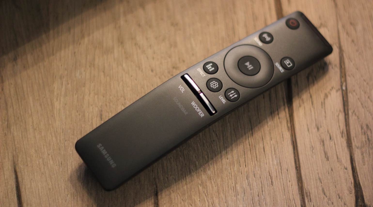 Er wordt ook een kleine maar handige afstandsbediening meegeleverd, welke de looks heeft van de afstandsbediening die dit jaar met de tv’s van Samsung geleverd wordt. De accessoire is klein maar ligt comfortabel in de hand en is netjes afgewerkt. Je vindt er alle basisfuncties op terug zodat je snel aan de slag kunt. De volume-knop en woofer-knop zijn wat anders dan we gewend zijn maar maken het door naar boven en onder te tikken mogelijk het volume aan te passen.
