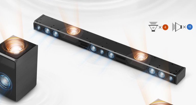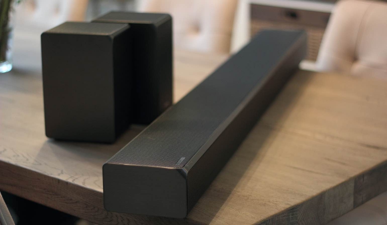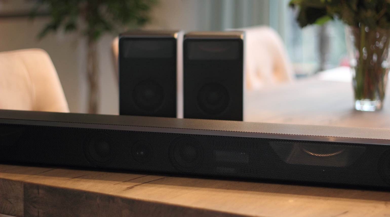 In een ‘echte’ Dolby Atmos opstelling heb je onder meer luidsprekers aan het plafond hangen maar de meeste mensen zitten hier niet op te wachten. Een alternatief zijn luidsprekers die audio richting het plafond sturen en middels weerkaatsing de audio-objecten van boven de luisterpositie laten komen. Een echte soundbar kunnen we dit systeem niet noemen want je moet de twee speakers aan de achterzijde dus ook nog kwijt, plus de draadloze subwoofer. Voor het complete pakket moet ook diep in de buidel getast worden; de adviesprijs is 1.499 euro.