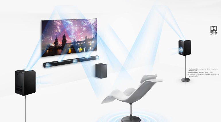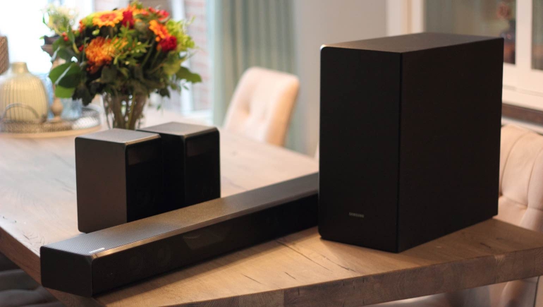 Een soundbar heeft ons nog niet vaak kunnen overtuigen als het op surroundsound aankomt en we zijn al helemaal sceptisch wanneer we de term Dolby Atmos daar bij zien staan. Maar, op papier gaven we Samsung toch wat vertrouwen, mede omdat er dus twee extra speakers achterin de kamer geplaatst moeten worden. Samsung met de Dolby Atmos-modules die naar boven wijzen zou dit wel eens kunnen werken.