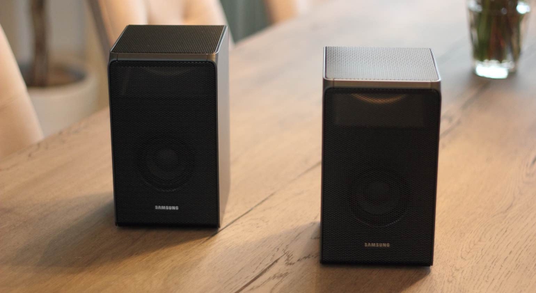 De twee surroundspeakers die meegeleverd worden kennen eenzelfde design; grijs afgewerkt met een metalen grill. Echter, hier moet wel gezegd worden dat draadloos niet helemaal draadloos is. Ze communiceren draadloos met de soundbar maar moeten nog wel middels een kabel van stroom voorzien worden. Je hebt dus twee stopcontacten nodig en de stroomkabel van de speakers is aan de korte kant. Hoewel de soundbar geleverd wordt met beugels om deze aan de muur te hangen moet je zelf een oplossing zoeken voor de surroundspeakers. Het is aan te raden deze op te hangen of op een standaard te zetten. De subwoofer is ook ‘draadloos’, wat betekent dat er alleen een kabel voor de voeding gelegd moet worden. Het apparaat heeft een matzwarte afwerking meekregen en moet – volgens Samsung – naast de tv geplaatst worden.