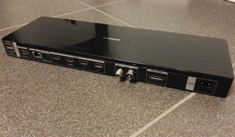 Stop je bronapparaten dus gewoon ergens in de kast, zet de One Connect erbij, en leid de dunne optische kabel voorzichtig naar de televisie (vermijd scherpe bochten, Samsung levert twee bochtstukjes mee zodat je op kritieke plaatsen de kabel met behulp van die bochten kunt vastzetten)