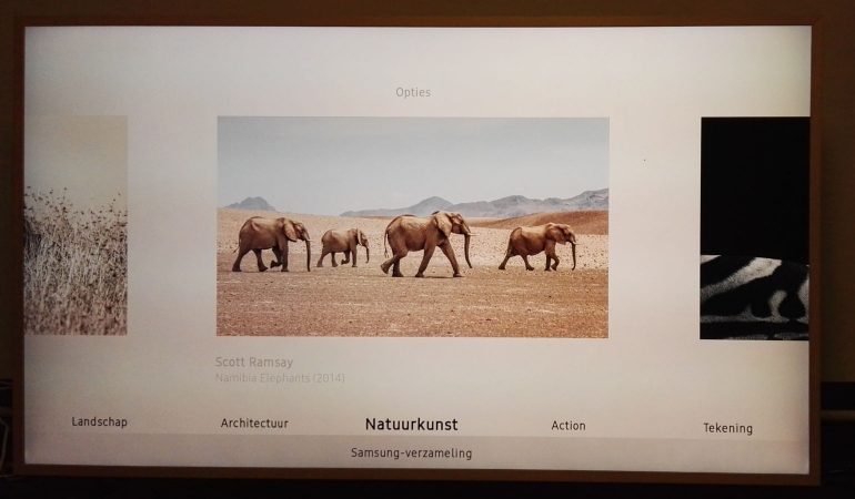 Een kunstkader is natuurlijk niet zinvol zonder kunst. Wie The Frame in huis haalt, krijgt toegang tot de Samsung Art Collectie. Met 100 beelden van 37 artiesten in 10 categorieën (landschap, patronen, tekeningen, actie, digitale kunst, architectuur…) heb je al een flinke bibliotheek. Sommige werken verschijnen op het volledige scherm, anderen gebruiken een digitale passe-partout. Deze collectie zal nog uitgebreid worden.