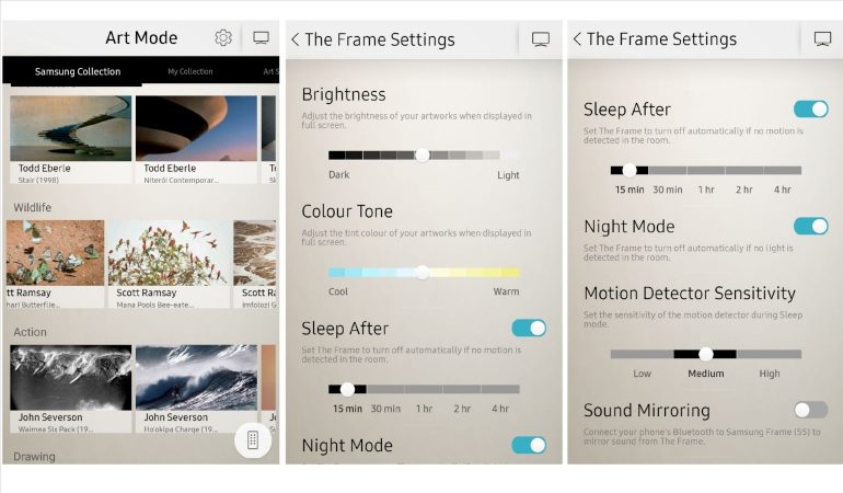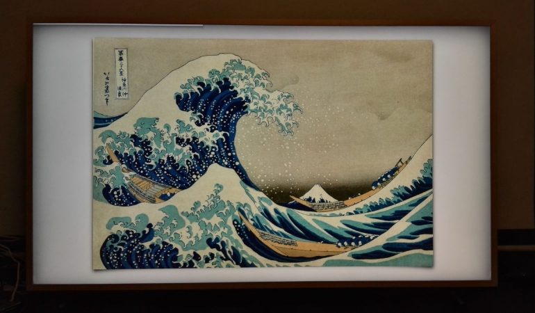 Maar de belangrijkste feature van The Frame is natuurlijk de Art-mode. Met een korte druk op de aan/uit toets schakel je van tv-mode naar kunst-mode. Vervolgens kies je een kunstwerk uit het uitgebreide aanbod, en klaar. Wat maakt The Frame nu zo bijzonder als kunstkader? Ten eerste probeert hij er zo veel mogelijk als een papieren kunstwerk uit te zien. Dat betekent dat de helderheid van het scherm aanzienlijk lager is in Art mode dan in tv mode. De lichtsensor past het beeld aan, op basis van het omgevingslicht. Zo wordt het beeld helderder wanneer er veel licht is, en omgekeerd. Een bewegingsdetector (met instelbare gevoeligheid) ziet wanneer er niemand aanwezig is in de kamer en schakelt het toestel uit na een zelf in te stellen periode (van 15 minuten tot vier uur). Activeer je de ‘Night Mode’, dan schakelt de Frame zichzelf uit wanneer er geen licht meer is in de kamer. Via Smart View kan je ook manueel de helderheid van het scherm instellen, en de kleurtemperatuur aanpassen.