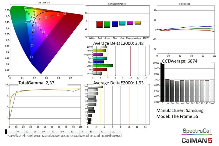The Frame heeft als duidelijk doel om een kunstkader te zijn dat zich zonder op te vallen tussen je andere kaders kan nestelen. HDR capaciteiten zijn daarvoor niet nodig, aangezien over het algemeen een beperkte helderheid volstaat. Er is wel HDR-ondersteuning voorzien op deze televisie (HDR10 en HLG, later ook HDR10+) en het scherm heeft een behoorlijk kleurbereik (88% DCI-P3, 64% Rec2020). De piekhelderheid is met ongeveer 280 nits wel aan de lage kant (we hebben Samsung gevraagd of ze deze meting kunnen bevestigen), en HDR-beelden worden dan ook aanzienlijk donkerder weergegeven dan ze werkelijk moeten zijn. Je kunt dus HDR-content bekijken, maar daarvoor koopt je The Frame niet, en hij is er eigenlijk ook niet echt voor uitgerust.