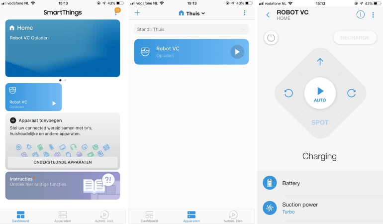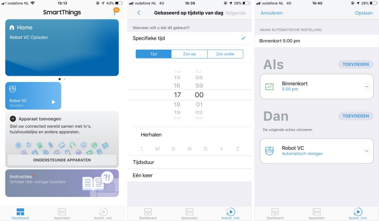De VR7000 is te bedienen en installeren middels de SmartThings-app van Samsung. Deze app is de plek waar alle compatibele SmartThings-apparaten in naar voren komen, in ons geval alleen de stofzuiger. De app geeft je een overzicht van alle verbonden apparaten, laat je deze apparaten bedienen en maakt het mogelijk geautomatiseerde regels aan te maken. Wij hebben alleen de stofzuiger dus het opstellen van regels is wat beperkt, maar je kunt bijvoorbeeld instellen dat als je van huis gaat de stofzuiger automatisch begint schoon te maken. Of je kunt een regel aanmaken waarmee de stofzuiger om de dag op een specifiek tijdstip begint met zuigen. Als je andere compatibele apparaten en sensoren hebt kun je natuurlijk nog interessantere en geavanceerdere regels aanmaken.