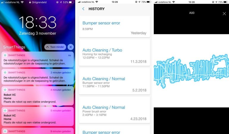 De VR7000 heeft in de SmartThings-app een History-sectie waar je kunt zien wat er gedaan is en welke foutmeldingen er gegeven worden. Deze functie is echter niet bijzonder te noemen. De ene keer verschijnt er wel iets na een zuigbeurt, de andere keer niet. We hebben het liefst dat elke activiteit hier zichtbaar is. Daarbij maakt de stofzuiger een kaart wanneer hij de hele ruimte gezogen heeft, maar daar heb je weinig aan. De kaart toont puur de bewegingen van het apparaat en maakt voor jou als gebruiker weinig echt duidelijk. De Neato, daarentegen, geeft je een mooie kaart van de ruimte zodat je precies ziet of de stofzuiger overal geweest is. Bij diverse modellen van het merk kun je daarnaast ook nog op de kaart aangeven waar de stofzuiger moet gaan schoonmaken. Deze functies missen we toch wel. De kaart verschijnt overigens ook alleen wanneer de stofzuiger de hele ruimte gedaan heeft (automatisch) en teruggekeerd is naar het laadstation.