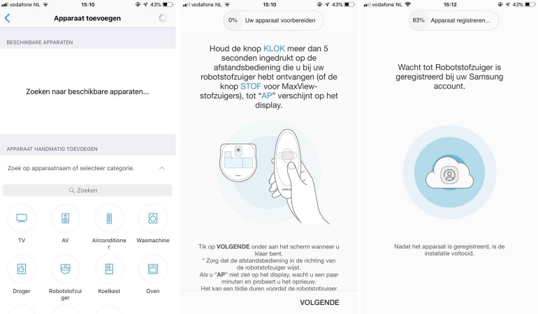 De installatie van de Samsung robotstofzuiger is een fluitje van een cent. Je vindt een plekje voor het laadstation – dat de stofzuiger zelf moet kunnen bereiken – en middels een druk op de knop kan het apparaat aan je WiFi-netwerk gekoppeld worden. Hiervoor moet je wel de SmartThings-app van Samsung (iOS en Android) downloaden en even een account aanmaken.