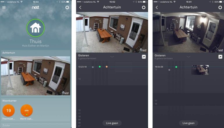 En dan hebben we nog de Thuis/Afwezigfunctie waar we in voorgaande reviews van Nest-producten vrij positief over waren. Echter, sinds het gebruik van de camera lijkt er een soort bug op te treden. Als we het huis verlaten spring Nest in de Afwezigmodus, zowel qua camera (aan) en Thermostaat (Eco). Dat is prima. Maar, zo nu en dan schiet Nest automatisch weer in Thuis terwijl er niemand is en blijft de camera aanstaan terwijl dat in de Thuismodus niet zo moeten kunnen. Een handmatige aanpassing via de app lost het op maar vooralsnog zijn we er niet achter gekomen waar deze bug vandaan komt.