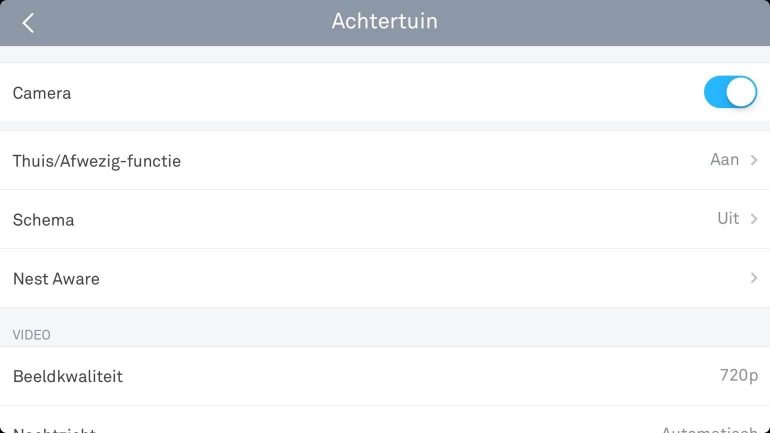 Qua gebruik komt de Nest Cam Outdoor eigenlijk precies overeen met de normale Nest Cam, de camera die voor binnen bedoeld is. Beide camera’s worden gekoppeld met de Nest-app en daar verschijnen dus ook alle instellingen en kun je de camera monitoren. Op het homescreen van de app zie je het live-beeld van de camera terug (als deze aanstaat) en als je andere Nest-producten hebt staan die ook op het beginscherm.