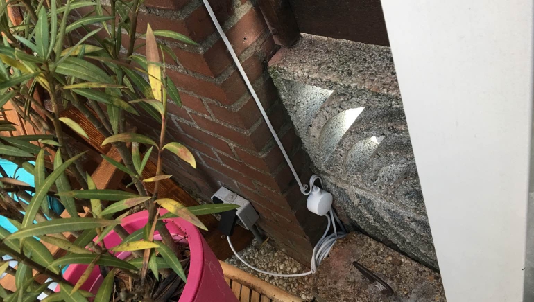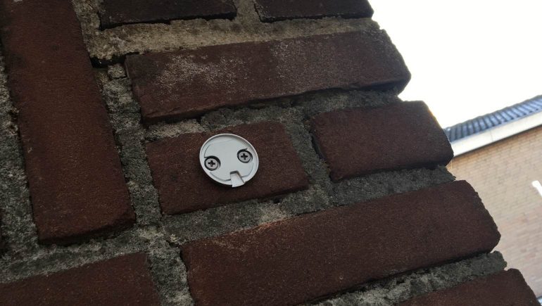 Vervolgens kun je de camera definitief bevestigen. Hiervoor worden opzetstukjes, magneten, pluggen en schroeven meegeleverd. Je hebt zelf alleen een boor en een schroevendraaier nodig. Bekijk eerst goed hoe je de kabels (waar je flink wat lengte van meekrijgt) vanuit de positie van de camera wilt laten lopen. Wij hebben ervoor gekozen de usb-kabel om een hoekje van de muur te trekken, naar beneden te laten lopen en zo’n 20 centimeter boven de grond (ivm water en sneeuw) aan te sluiten op de ac-adapter.