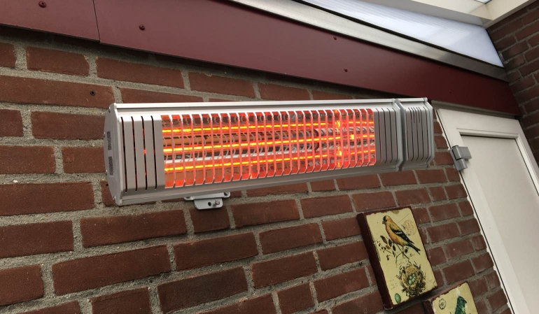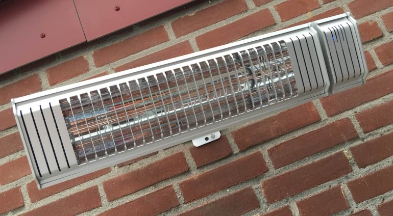 Welke terrasverwarmer voor jou interessant is hangt af van vele factoren, waaronder het budget dat je hebt, de oppervlakte die je wilt verwarmen, de flexibiliteit die je wilt hebben bij montage en gebruik, het soort lamp dat je wilt gebruiken en het licht dat je in de ruimte wilt laten stralen. Wij hebben gekozen voor een terrasverwarmer met een ‘Amber’ infraroodlamp, wat inhoudt dat de lamp minder fel straalt en eigenlijk alleen een lichtgele/orange gloed verzorgt. Hierdoor krijg je naast wat warmte ook een gezellig sfeer en kleurt niet iedereen direct knalrood. Ook wordt de warmte van deze lamp niet beïnvloed door de wind die door onze overkapping kan waaien; ook met wat wind blijf je de warmte voelen. Daarbij is de heater IP65 gecertificeerd, wat inhoudt dat hij tegen spatwater en stof bestand is.