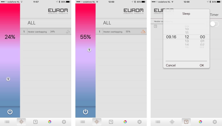 De Eurom-app is een fraai vormgegeven applicatie, met een duidelijke structuur en een prima gebruiksgemak. Sommige opties, waaronder het oscilleren en de schokbeveiliging, mogen wat duidelijker getoond en uitgelegd worden maar over het algemeen kan iedereen hier snel mee overweg. Er is echter wel een belangrijker minpunt te vinden; je kunt de heater maar met één toestel koppelen. Wij zijn in huis met zijn tweeën en ik ben niet altijd aanwezig. Mijn vriendin zou de heater dus ook graag middels de app kunnen bedienen maar moet hiervoor per se de afstandsbediening gebruiken.