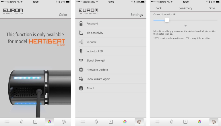 De vijfde en laatste tab is de plek voor alle instellingen. Hier kun je het wachtwoord voor je heater wijzigen, de heater een eigen naam geven, de indicatieleds aan de voorzijde (blauw voor bluetooth) aan- of uitzetten, de signaalsterkte controleren, de firmware updaten en de heater opnieuw instellen. Er is ook een optie genaamd ‘Tilt sensitivity’ aanwezig, wat ons het idee gaf dat de heater ook verticaal automatisch zou moeten kunnen draaien, maar na wat research bleek dit de schokbeveiliging te zijn. Deze beveiliging schakelt de heater uit wanneer het een schok denkt te herkennen of/en wanneer de heater teveel kantelt, en deze optie maakt het mogelijk de gevoeligheid hiervoor aan te passen. Wij hebben de gevoeligheid laag gezet want bij meer dan 40 procent sloeg het apparaat alarm zodra we de functie voor oscilleren aanzetten, en dat terwijl de heater toch stevig vastzit.