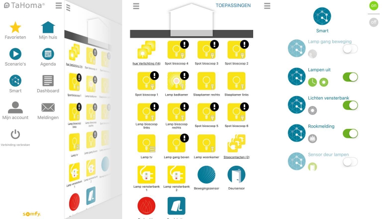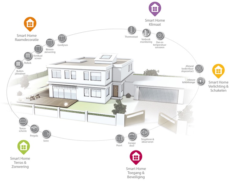 Somfy’s smart home-systeem kan vervolgens uitgebreid worden met een groot aantal producten. Je hebt de zogenaamde sensoren en melders die een input ontvangen en deze richting de centrale sturen, en je hebt de apparaten die op de input kunnen reageren. Sensoren en melders zijn er in de vorm van onder andere rookmelders, lichtsensoren en deursensoren. Apparaten die op input kunnen reageren zijn onder andere slimme stekkers, thermostaten en natuurlijk de bekende producten met een Somfy-motor zoals de garagedeur en de raamdecoratie. Dat laatste is wel van belang want het smart home-systeem van Somfy is in de basis eigenlijk met name geschikt voor mensen die al gebruikmaken van Somfy-producten of compatibele producten van andere fabrikanten. Vervolgens kun je dit systeem uitbreiden met sensoren en melders om de bediening van de Somfy-producten of die van partners te automatiseren.